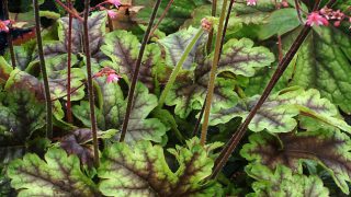 Heucherella 'Tapestry' 草丈25㎝、中心部が赤黒く染まる緑の葉でピンク色の可憐な花を咲かせる。開花期 5-6月 冬季 常緑 日当たり 明るい日陰 耐寒性 強 水やり 普通 施肥 春・秋に油粕肥料、生育時に有機液肥を2週...