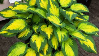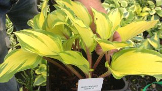 HOSTA 'Wide Brim' 草丈40cm、株張り60cm、独特なバターイエローのやや不規則な覆輪斑を持つ人気品種。 花はラベンダー色。 強光による葉焼けに注意。 RHS1993 AGM受賞。 15cmポット植え 【耐寒性】強 【日照...