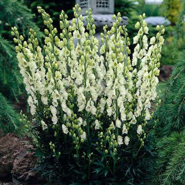 Aconitum napel Album 草丈90㎝、細かな切れ込みの葉に純白の花。切り花に向く。