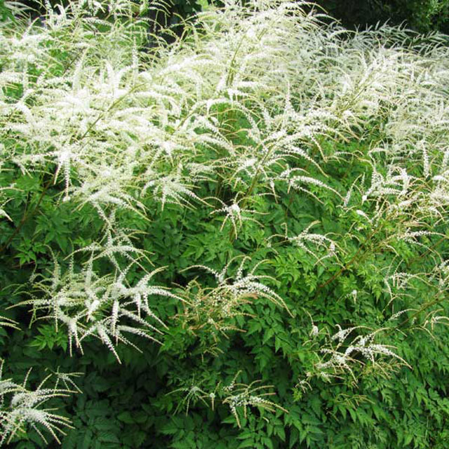 Aruncus dioicus ‘Johannisfest’ 草丈45cm、伸びる花茎の先に白く細かい花を咲かせる。