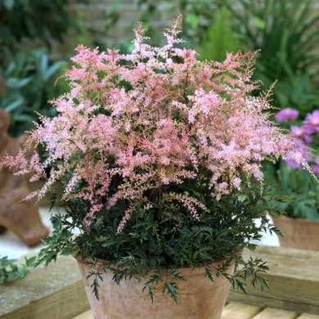 アスチルベAstilbe x Simplicifolia ‘Sprite’ 草丈30cm、淡いローズピンクの花穂に銅緑色の葉が特徴。ペレニアル・プラント・オブ・ザ・イヤーを1994年に受賞。