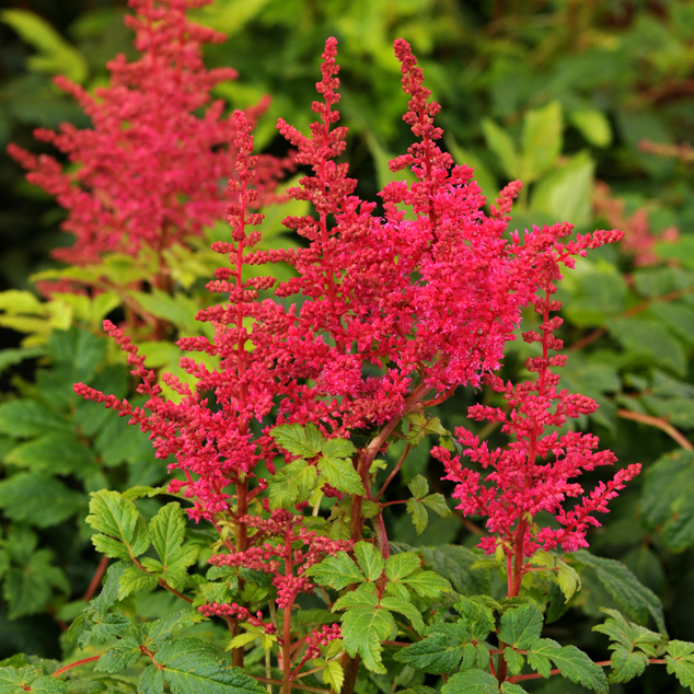 Astilbe x ‘Younique Carmine’ 草丈35cm、小型で花付き良く、耐病性に優れた濃赤品種。