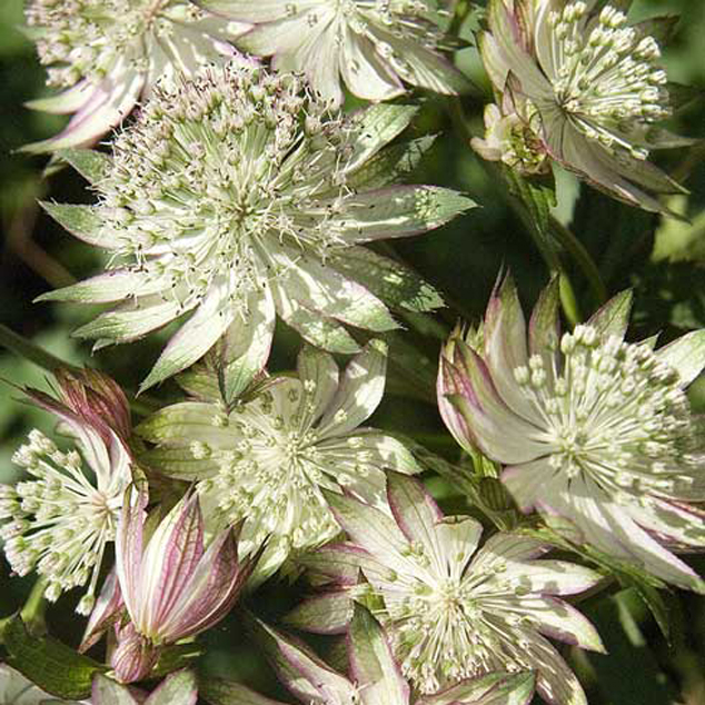Astrantia major ‘Star of Royals’ 草丈60cm、白にピンクを交えた優しい花色。梅雨時期は雨よけをすると管理しやすい。