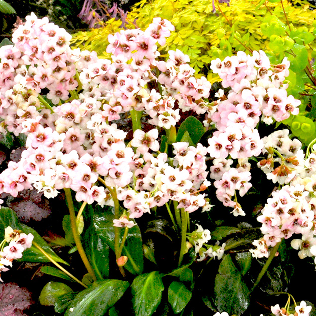 Bergenia ‘Angel Kiss’ 草丈40㎝、淡い桜色のセミダブルで秋からの紅葉も美しい。