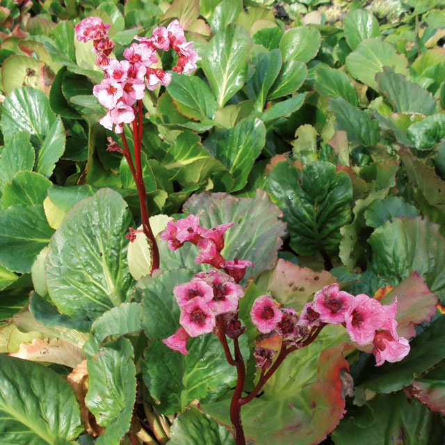 Bergenia Magic Giant 草丈40㎝、大型で雄大な葉にピンク色の可憐な花を咲かせる大型品種。紅葉も美しい。