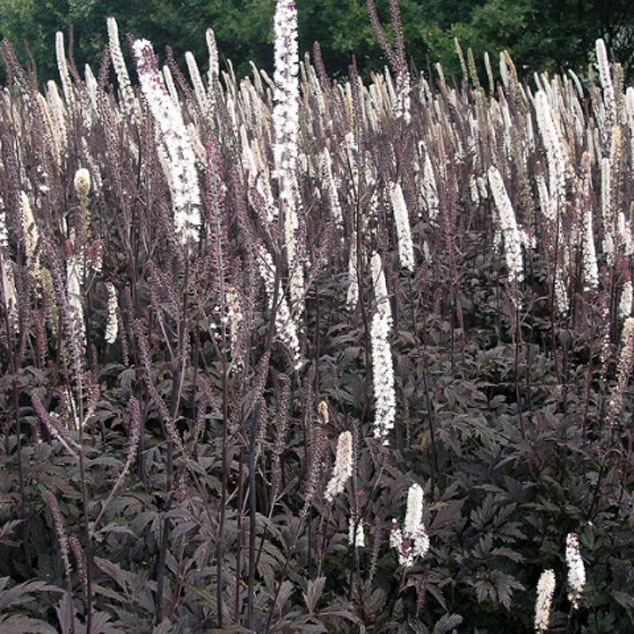 Cimicifuga(Actaea) ramos. ‘Brunette’ 草丈150cm、濃紫色の銅葉品種でピンクがかった白いブラシ状の花をつける。