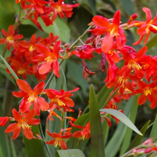 アヤメCrocosmia ‘Carmine Brilliant’草丈50cm、鮮やかな朱赤色の花の細葉品種。