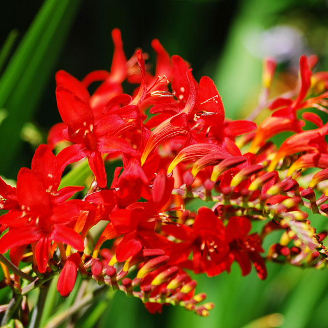 クロコスミア「ルシファー」 【D4227510】 アヤメ 2019.10.26 Crocosmia ‘Lucifer’ 草丈120cm、斜上する濃赤の大型品種で切花に向く。 開花期 6-7月 冬季 落葉 日当たり 日向 耐寒性 強 水やり 普通 施肥 春・秋に油粕肥料、生育時に有機液肥を2週間に1回程度 用土 オリジナル園芸培養土