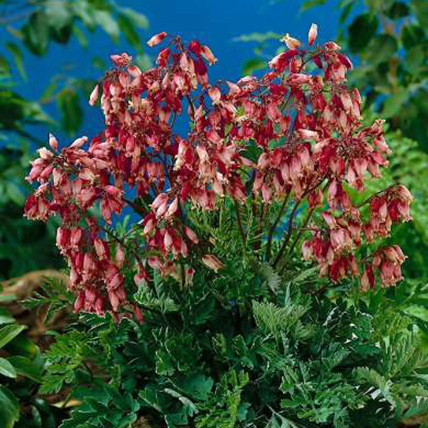 Dicentra formosa ‘Bacchanal’ 草丈30㎝、銀色がかった葉に桃赤色のハート型の花。