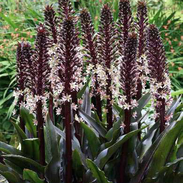 Eucomis comosa ‘Sparkling Rosy’ 草丈60cm、濃赤紫色の花茎に淡いピンク色の花を付ける。花後の果実も面白い。