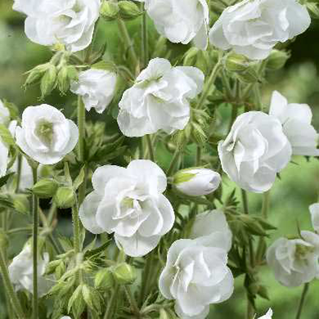 Geranium pratense ‘Laura’ 草丈60cm、清楚な純白の八重咲品種でウドン粉病耐性がある。