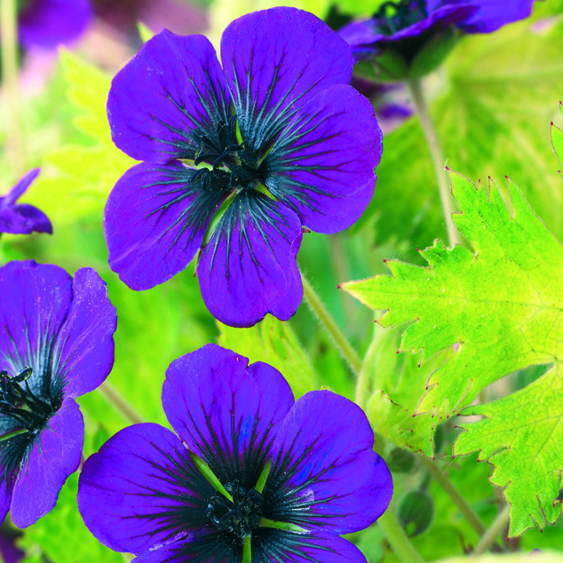 Geranium ‘Sandrine’ 草丈75㎝、赤紫色に黒芯のユニークな花。新葉は明るい黄緑色で花とのコントラストも美しい。