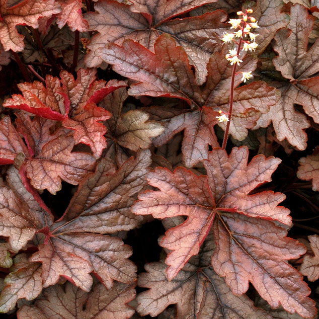 Heucherella ‘Gunsmoke’ 草丈40㎝、オレンジがかった銀色のユニークな色合いの葉が美しい。