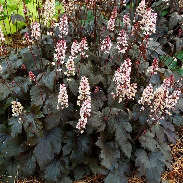 Heucherella Burnished Bronze 草丈20㎝、切れ込みのある黒褐色の葉にピンクのブラシ状の花。