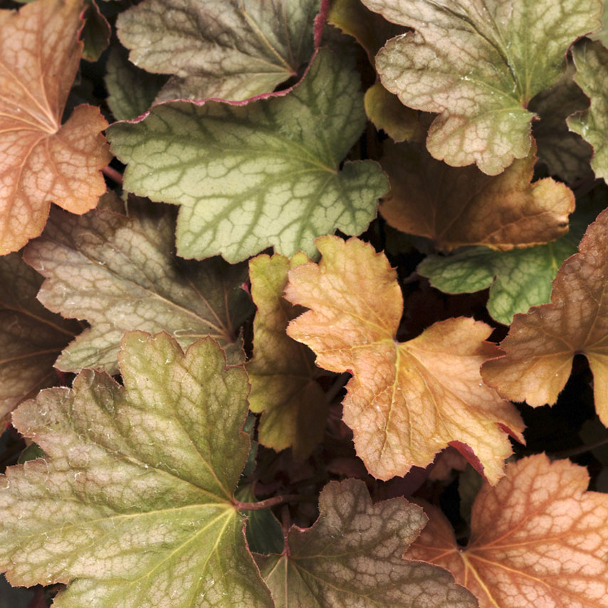 Heuchera ‘Watermelon’ 草丈25cm、桃褐色から次第に緑とシルバーに変化する新品種。カーニバル・シリーズ。