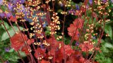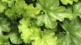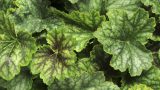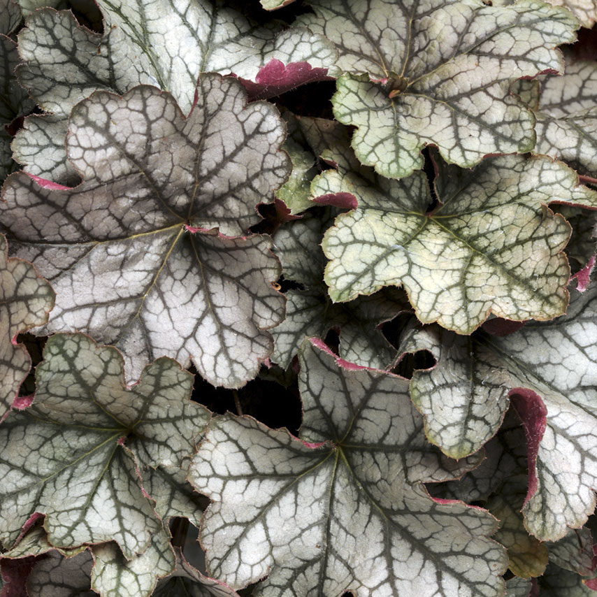 Heuchera ‘Silver Streak’ 草丈25cm、濃緑色に鮮やかなシルバー模様の新品種。カーニバル・シリーズ。