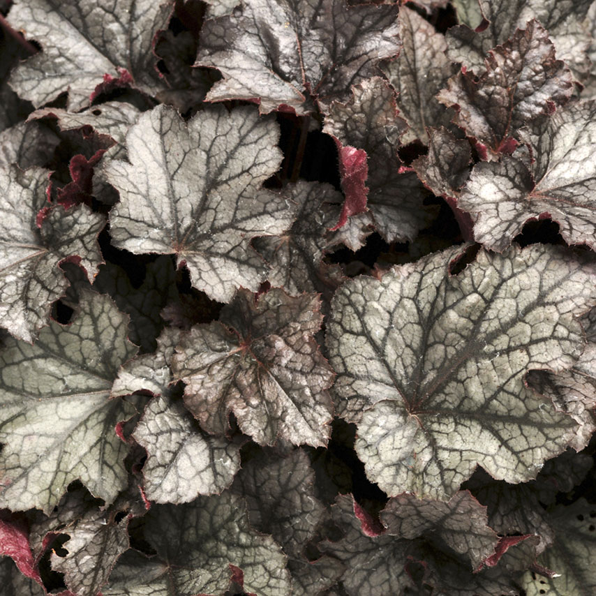 Heuchera ‘Plum Crazy’ 草丈25cm、黒紫色にシルバー模様の新品種。カーニバル・シリーズ。