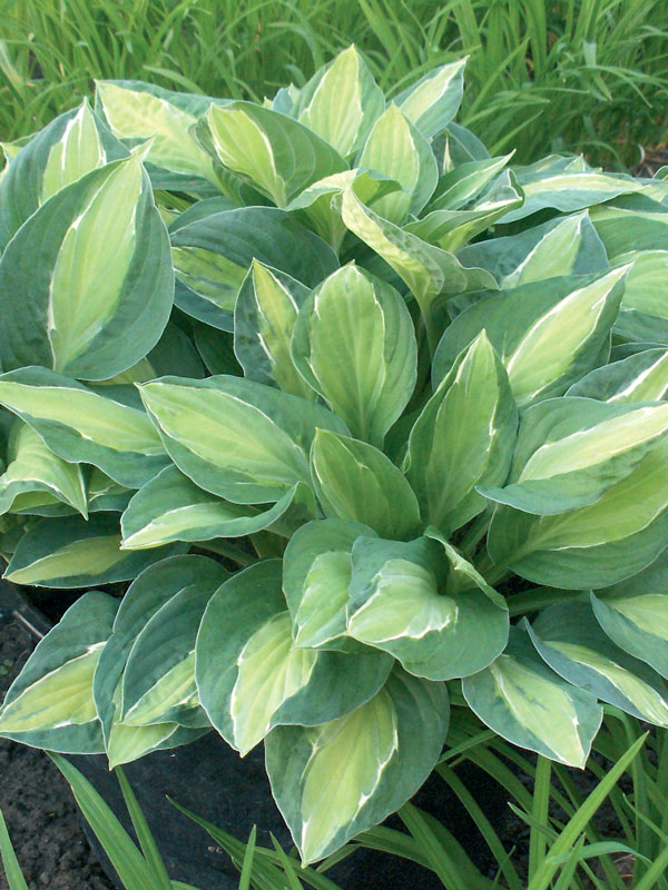 Hosta ‘Gypsy Rose’ 草丈35cm、三光覆輪といわれるタイプの斑入りで緑、黄色、白の組み合わせが美しい。