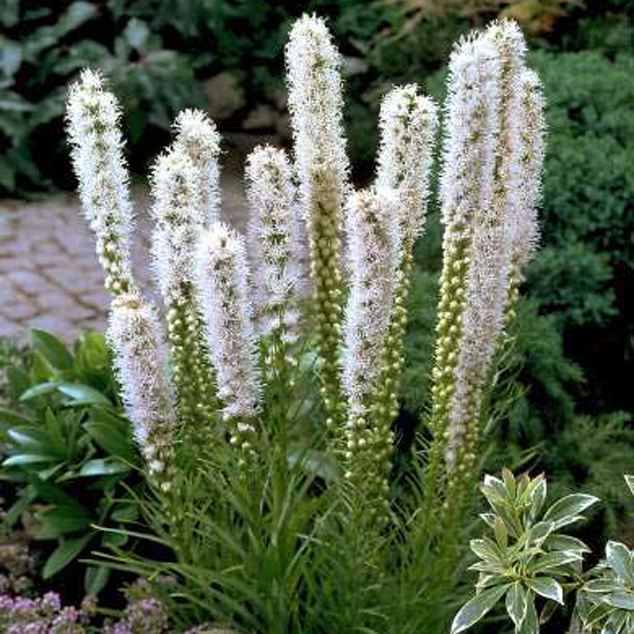 Liatris spicata ‘Floristan Weiss’ 草丈75cm、白いブラシ状の花は切花に向く。