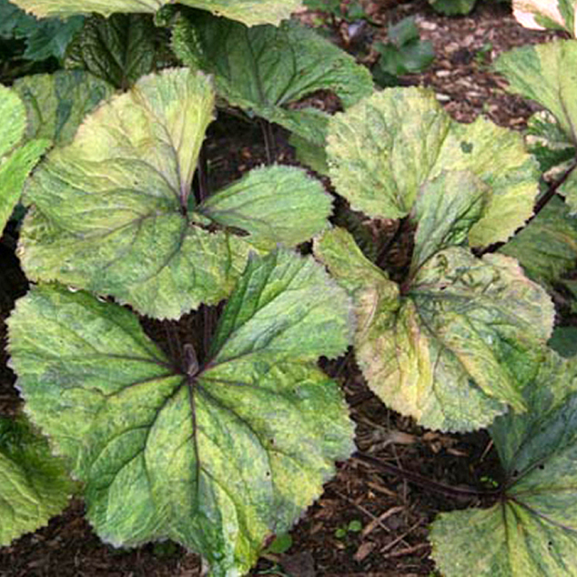 Ligularia ‘Osiris Pistache’ 草丈50㎝、赤い葉脈に細かな黄散斑の美麗葉選抜品種。