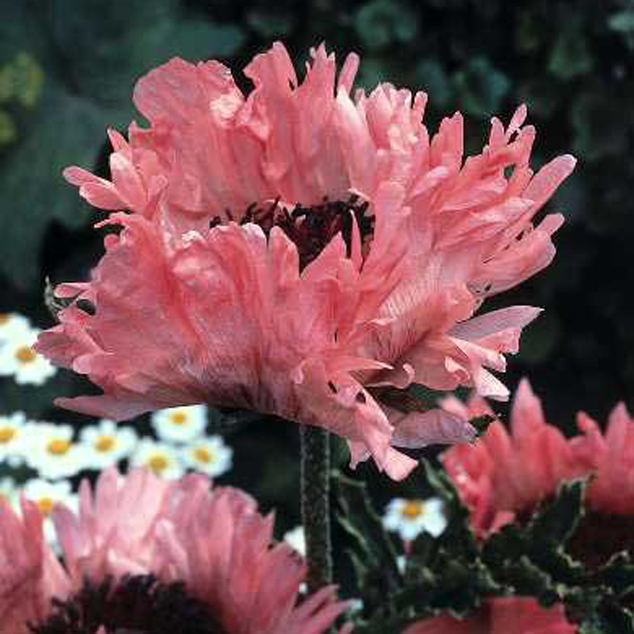 Papaver orientale ‘Fancy Feathers’ 草丈60cm、フラミンゴ・ピンクのフリル花、半八重品種。ラッフル・シリーズ。