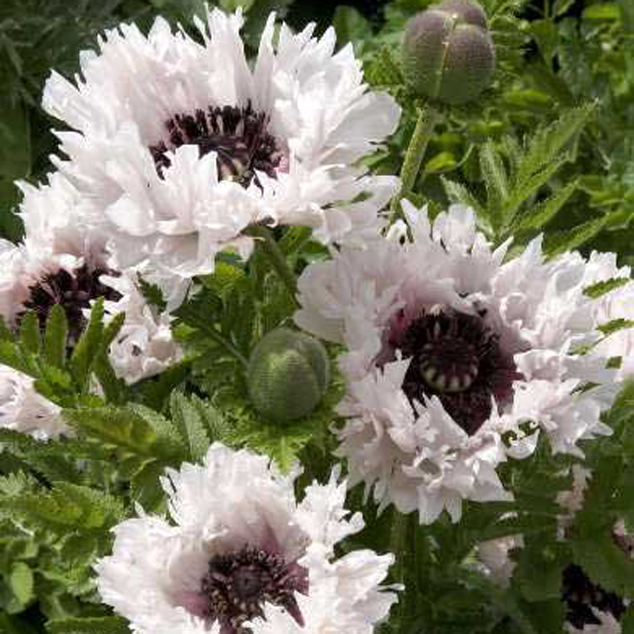 Papaver orientale ‘Miss Piggy’ 草丈45cm、白く切れ込みの深い花弁で中心部はライラック・ピンク。ラッフル・シリーズ。