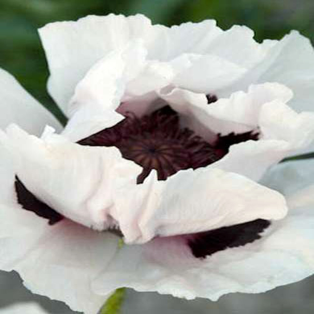 Papaver orien ‘Snow Goose’ 草丈60㎝、フリルの半八重咲きで白い花弁に黒紫色のブロッチが入る。