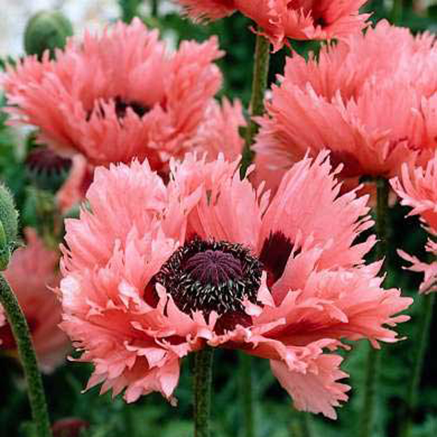 ケシPapaver orientale ‘Pink Ruffles’ 草丈75cm、深く切れ込んだサーモン・ピンクの花弁が特徴の多花性品種。