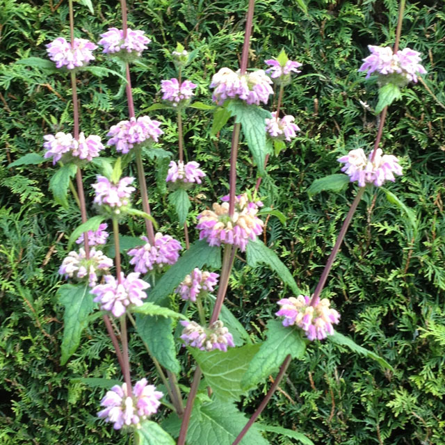 フロミス「アマゾン」 【D4818001】 シソ 2019.10.26 Phlomis tuber Amazone 草丈110㎝、桃藤色の花の塊を段に付ける雄大な品種。 開花期 7-8月 冬季 落葉 日当たり 日向 耐寒性 強 水やり 普通 施肥 春・秋に油粕肥料、生育時に有機液肥を2週間に1回程度 用土 オリジナル園芸培養土