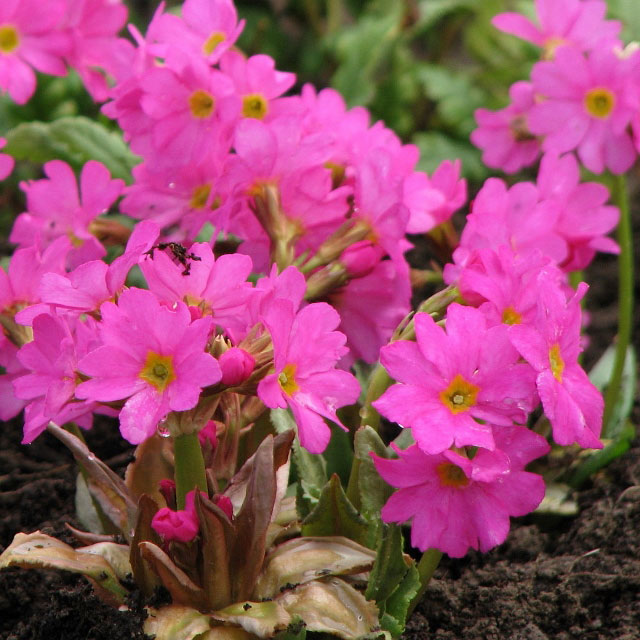Primula rosea ‘Gigas’ 草丈20cm、明るい濃ピンクの花を玉咲きに付ける。