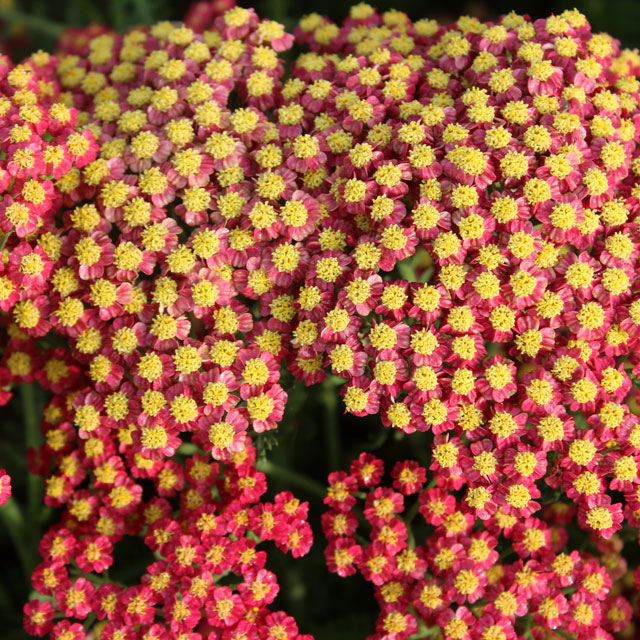 Achillea ‘Sparkling Contrast’ 草丈60cm、赤い花弁と黄色のシベのコントラストが美しい切花向き品種。