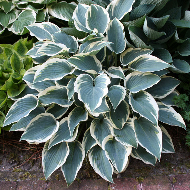 Hosta ‘El Nino’ 草丈45cm、ブルーの葉に白覆輪葉の新品種。