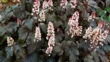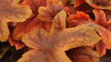 HEUCHERELLA ‘Eye Spy’ 草丈20cm、黄金色の葉の中心に赤い模様が入り、春には可憐なピンク色の花を多数付ける。花芽分化に低温を必要とせず花付き抜群。ファン・アンド・ゲームズ・コレクション。