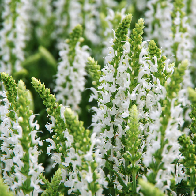 Salvia nemorosa ‘Snow Hill’ 草丈40cm、清楚な純白の花を多数付ける。
