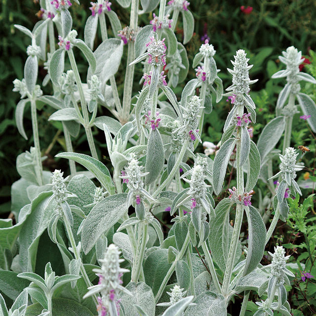 シソStachys byzantina 草丈60cm、細かな綿毛に覆われた葉は「ラムズイヤー」の別名で親しまれている。
