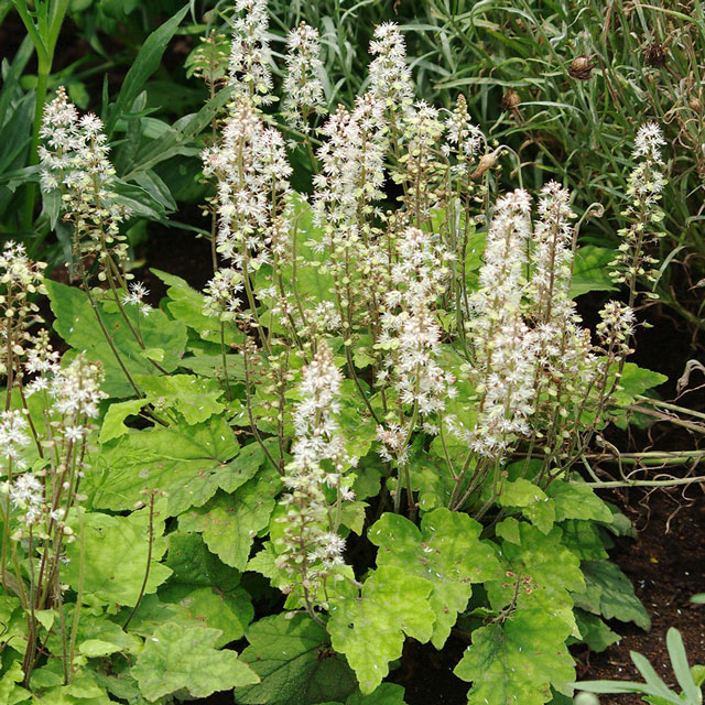 ユキノシタTiarella wherryi ‘Silverado’ 草丈30cm、ピンクがかった白い花を多数付ける。
