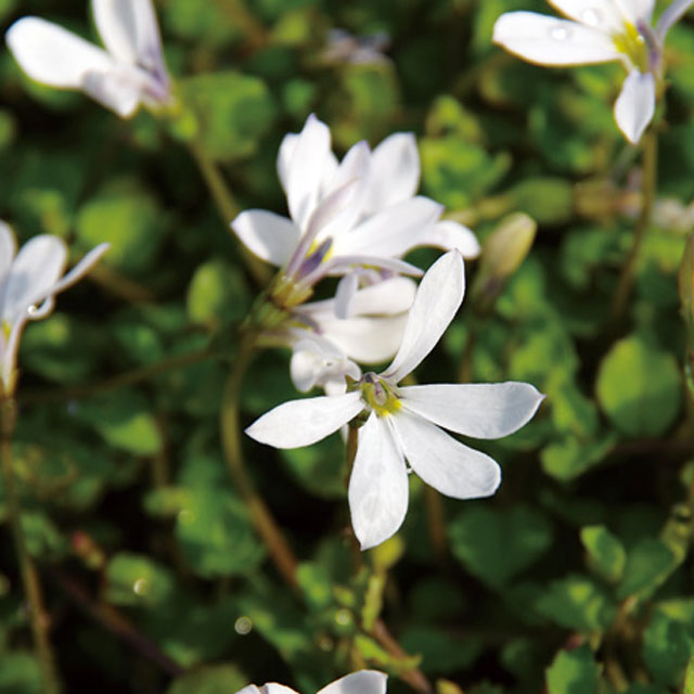 プラティア・アングラータ 【K16055】 キキョウ 2019.10.26 Pratia angulata 草丈5cm、マット状に広がり白い扇形の花を咲かせるグランドカバー。 開花期 5-9月 冬季 常緑 日当たり 日向 耐寒性 強 水やり 普通 施肥 春・秋に油粕肥料、生育時に有機液肥を2週間に1回程度 用土 オリジナル宿根草の土