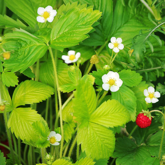 Fragaria vesca ‘Golden Alexandria’ 草丈20cm、黄金色の葉が美しい選抜品種。
