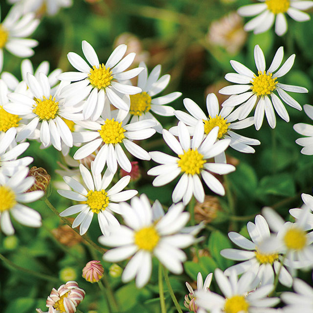 Bellis ‘Pebilian Daisy Velium’ 草丈5cm、花弁の裏に赤いストライプがある原種デージー