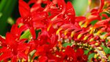 Crocosmia ‘Lucifer’ 草丈120cm、斜上する濃赤の大型品種で切花に向く。