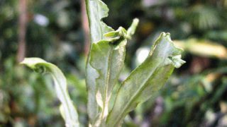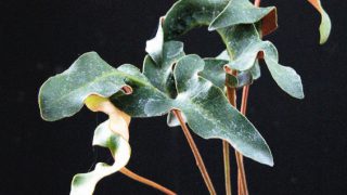 枝打ち獅子鈴虫剣の葉変り最上芸品種。開花期 冬季 常緑 日当たり 日陰 耐寒性 強 水やり 普通 施肥 生育期に有機液肥を2週間に1回程度 用土 基本培養土/ミズゴケ