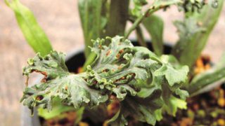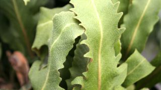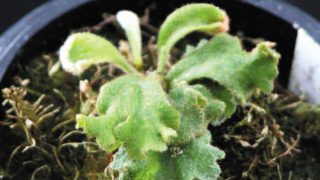 葉がねじれる烏帽子芸。開花期 冬季 常緑 日当たり 日陰 耐寒性 中 水やり 普通 施肥 生育期に有機液肥を2週間に1回程度 用土 基本培養土/ミズゴケ