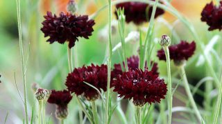 Centaurea cyanus 'Black Ball' 草丈80cm、シルバーの葉とチョコレート色の花のコントラストが美しい。開花期 4-7月 冬季 落葉 日当たり 日向 耐寒性 強 水やり 普通 施肥 春・秋に油粕肥料、生育時に有機液...