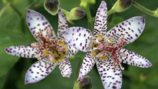 藤紫色の斑点が美しい。開花期 8-10月 冬季 落葉 日当たり 明るい日陰 耐寒性 強 水やり 普通 施肥 春・秋に油粕肥料、生育時に有機液肥を2週間に1回程度 用土 山野草の土/基本培養土